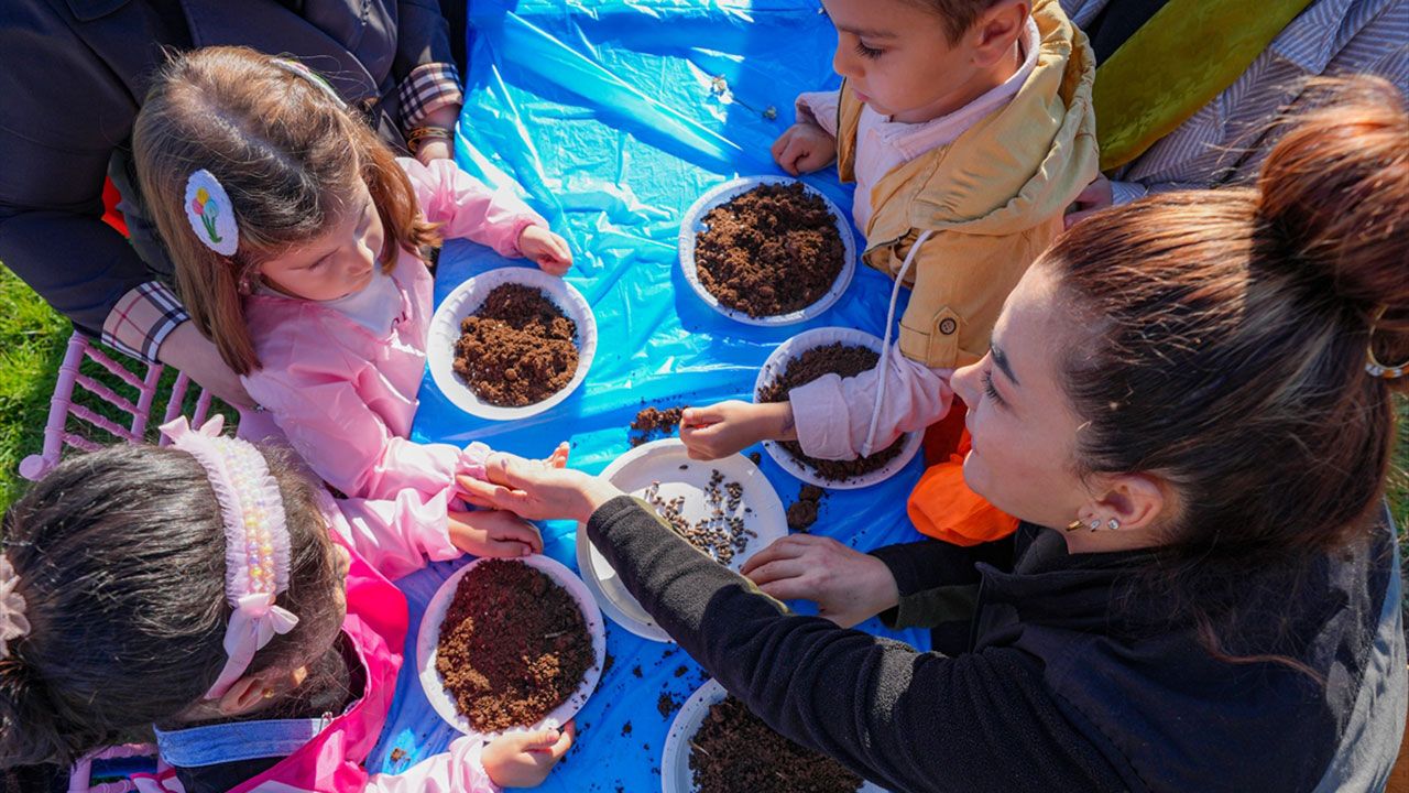 Adalet Anaokulu'nda düzenlenen etkinlikte de öğrenciler ebeveynleri, öğretmenleri ve orman mühendislerinin yardımıyla kazdığı toprağı çamur haline getirip içerisine tohum koydu.