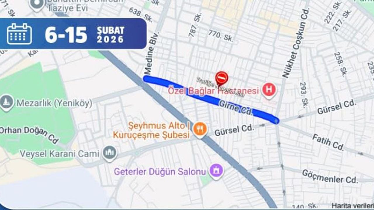 Yetkililerden yapılan açıklamaya göre, yıkım ve güvenlik tedbirleri nedeniyle cadde 6–15 Şubat 2026 tarihleri arasında 9 gün süreyle araç geçişine kapalı olacak.