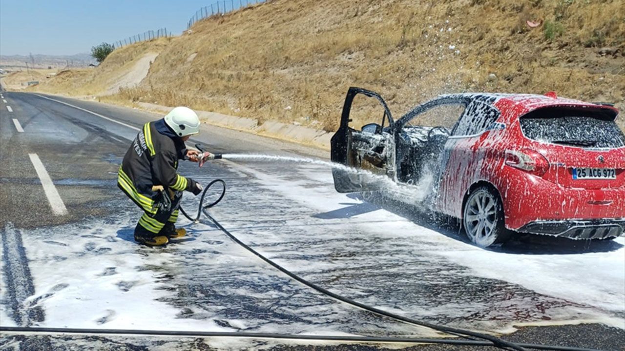Kırsal Çaytepe Mahallesi mevkisinde seyir halindeki 25 ACG 972 plakalı otomobilin motor kısmı henüz bilinmeyen nedenle alev aldı.