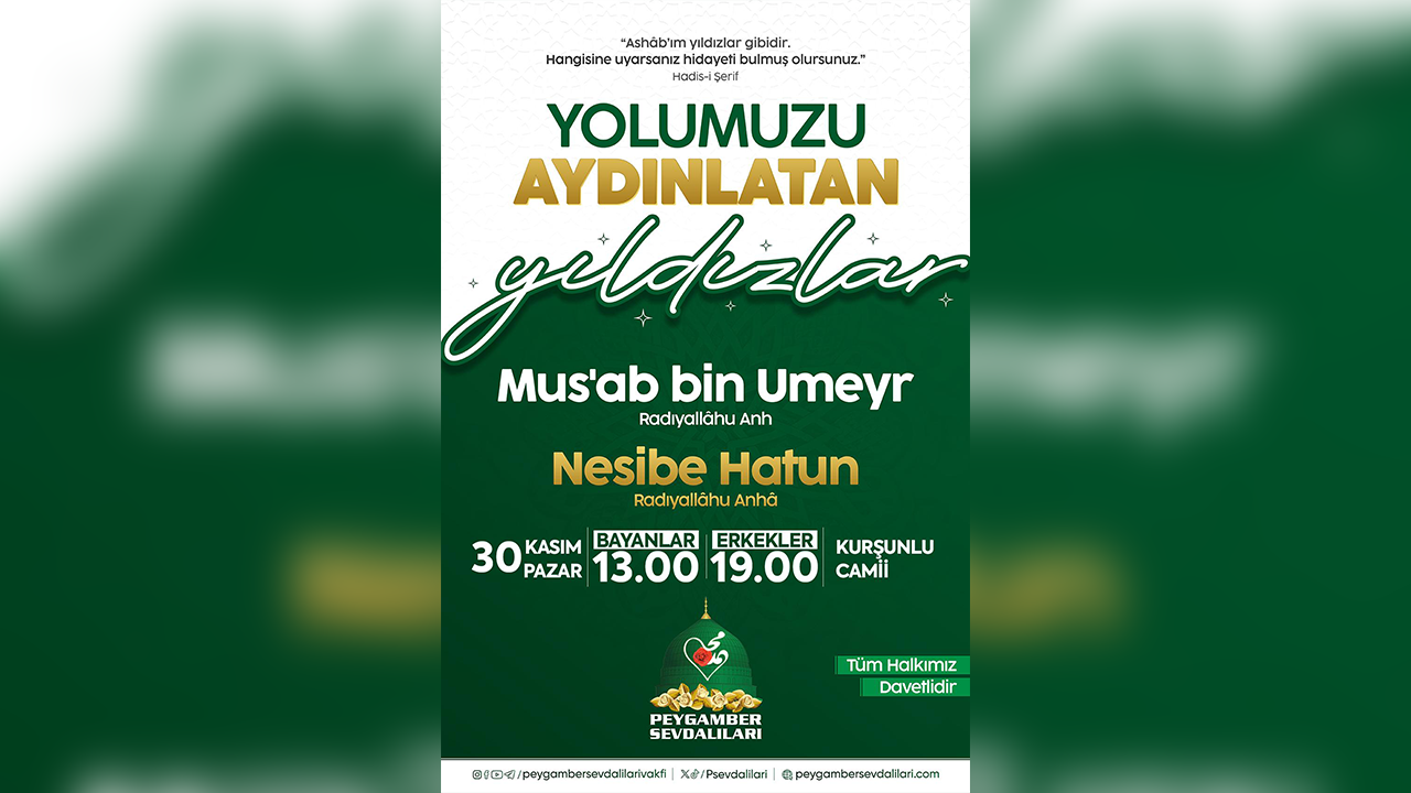 Bizler bu dünyevileşme ve yozlaşmadan kurtuluşun yegâne yolunun Peygamber Efendimiz Sallallahu Aleyhi Vesellem ve onun kutlu sahabelerinin yolu ve örnekliğinde kurtulacağımıza inanıyoruz. Bu meyanda pazar günü Kurşunlu Camii'nde saat 13.00'te bayanlara yönelik olarak Nesibe Hatun Radiyallahu Anhume'nin hayatını anlatan, akşam 19.00'da ise erkeklere yönelik Musab Bin Umeyr Radiyallahu Anhume'nin hayatını anlatan program düzenlenecek.