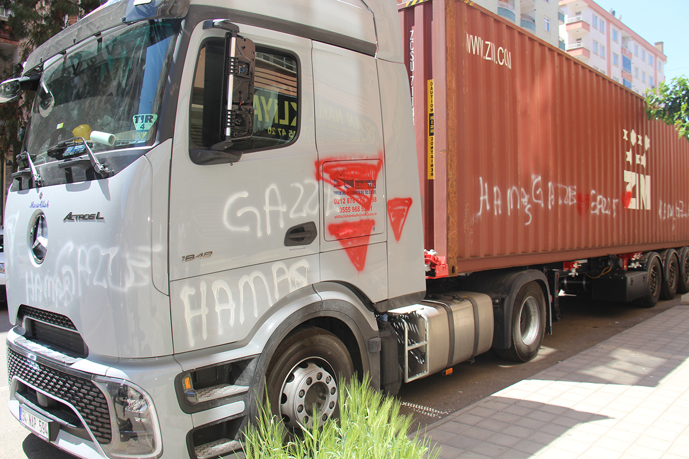 Grup üyeleri, aracın üzerine sprey boyayla "Gazze" ve "HAMAS" ifadelerini yazdı.