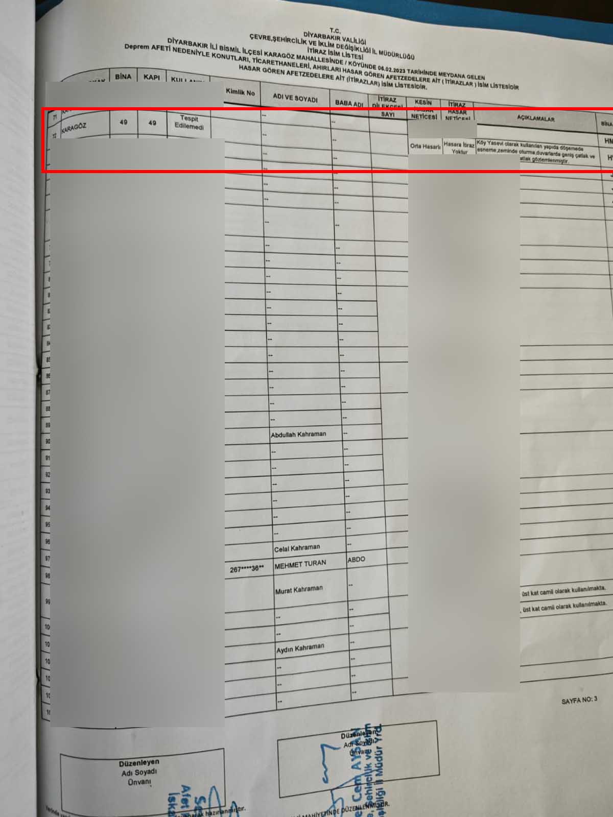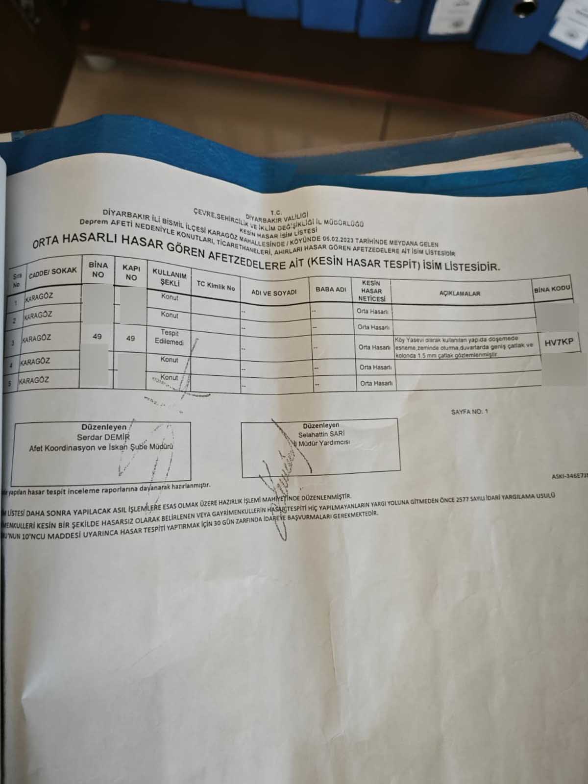Çevre, Şehircilik ve İklim Değişikliği İl Müdürlüğü’ne bağlı hasar tespit ekiplerince yapılan incelemeler sonucunda belirlenen hasar durumları, 25.03.2023 ile 25.04.2023 tarihleri arasında ilgili mahalle muhtarlıklarında askıya çıkarılmıştır. Askı sürecinde itiraz etmeyenler için tespitler, 01.06.2023 ve 01.07.2023 tarihlerinde yeniden ilan edilmiştir.