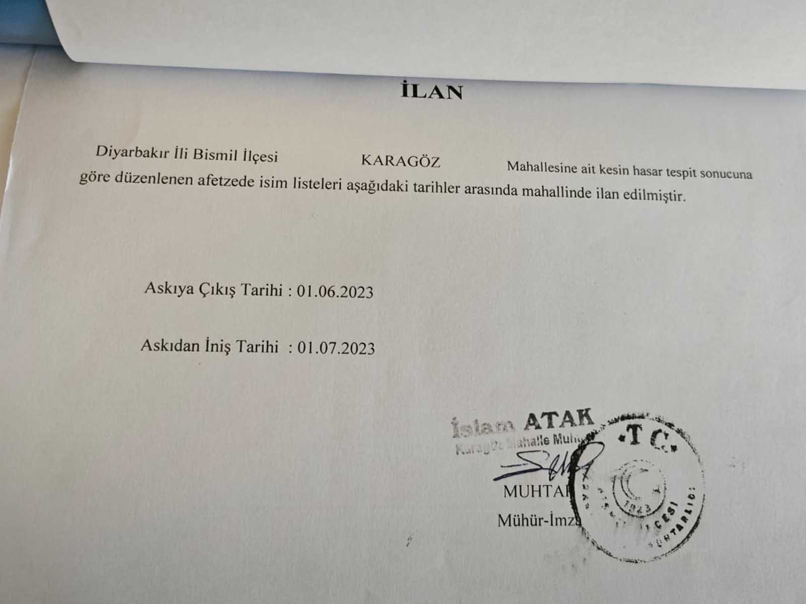 Bismil Kaymakamlığı’ndan konuya dair yapılan açıklamada, ilgili tutanağın 13 Şubat 2024 tarihinde mahalle muhtarına tebliğ edildiği belirtildi.
