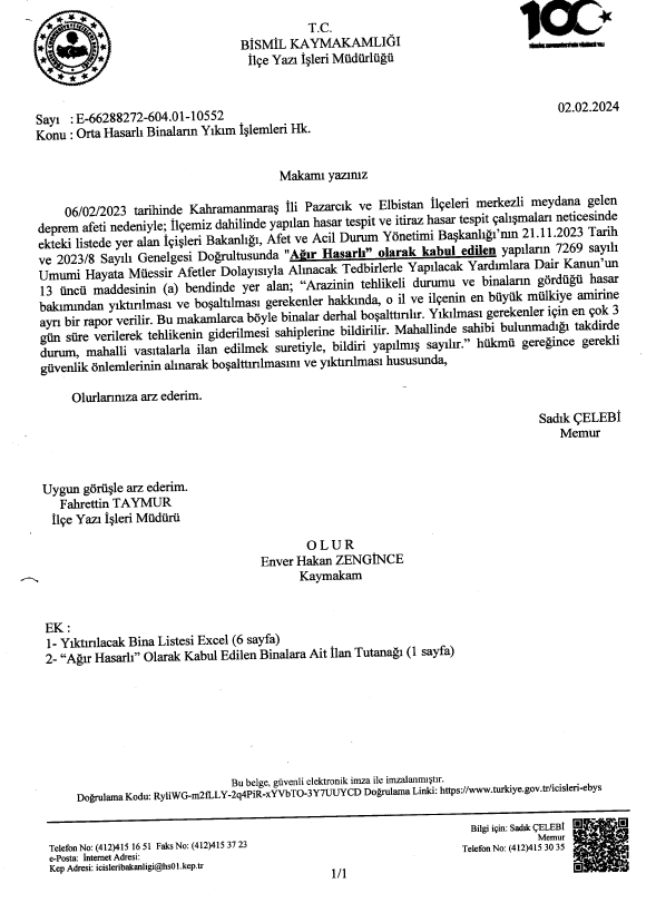 Kaymakamlığımız 08.02.2024 tarihli ve 10604 sayılı yazı ile riskli olduğu tespit edilen yapıların güçlendirme yapılmadığı için yıkılacağını bildirilmiş, bu karar 12.02.2024 – 15.02.2024 tarihleri arasında muhtarlıklarda ilan edilmiştir.