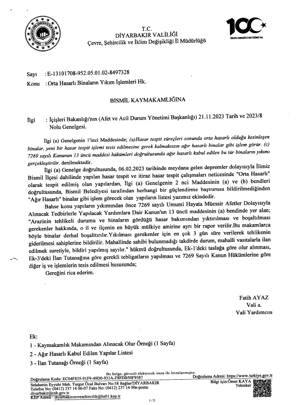 “06.02.2023 tarihinde Kahramanmaraş İli Pazarcık ve Elbistan ilçelerinde meydana gelen depremler nedeniyle Diyarbakır İli Bismil İlçesi'ndeki bazı yapılar hasar görmüştür.