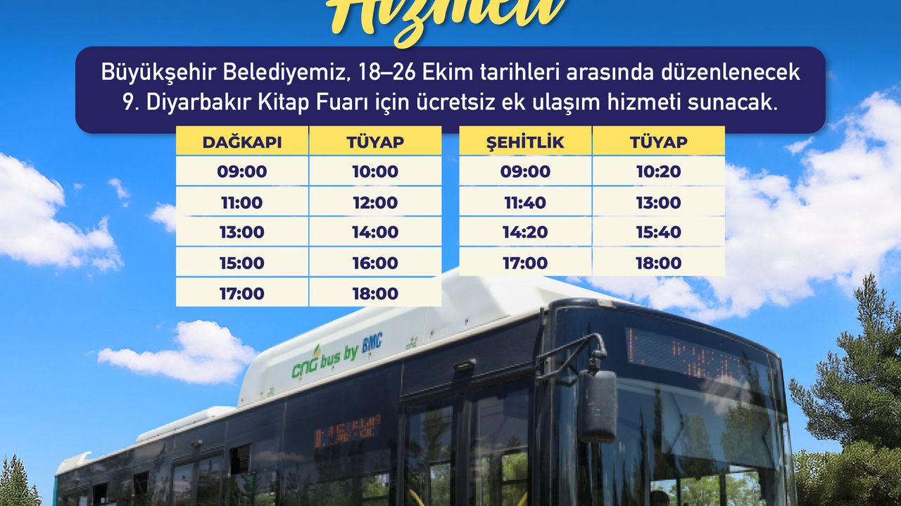 Diyarbakır Büyükşehir Beledeyesi'nin yaptığı duyuruya göre, 18–26 Ekim tarihleri arasında TÜYAP Kitap Fuarı için ücretsiz ek ulaşım hizmeti yapılacak.