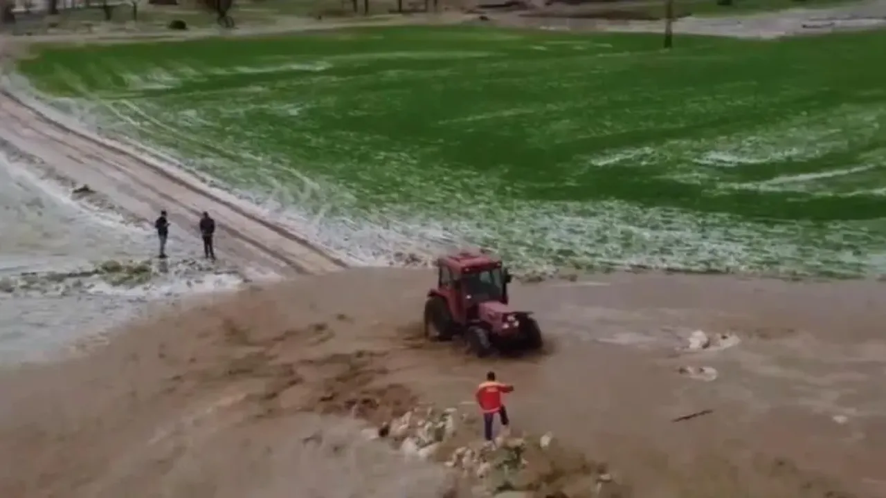 Taşkın sırasında bölgede bulunan bir kişi mahsur kaldı. Şahıs, olay yerine yaklaşan traktöre binerek güvenli alana alındı.