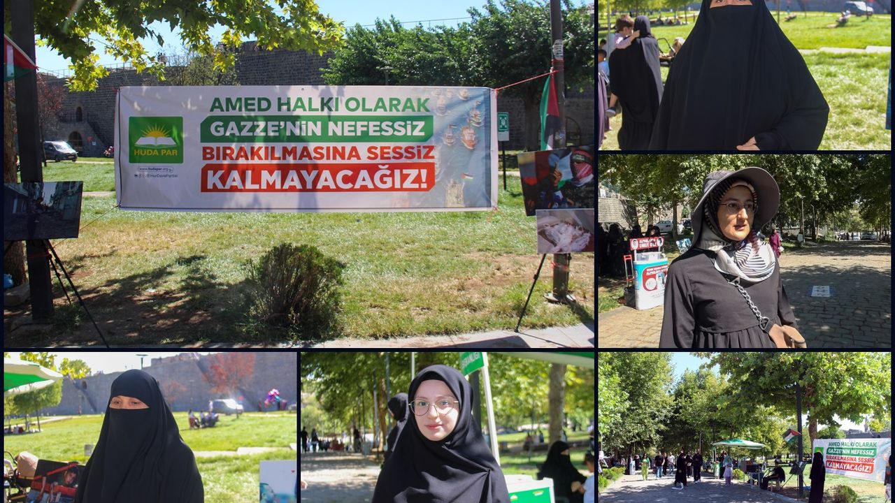 HÜDA PAR Diyarbakır Kadın Kolları Başkanlığı'da işgal rejiminin sürdürdüğü katliam ve soykırımlara dikkat çekmek ve Sumud Filosu'nun gündemdeki yerini korumak için merkez Sur ilçesi Hazreti Süleyman yerleşkesinde resim sergisi ve stant çalışması başlattı.