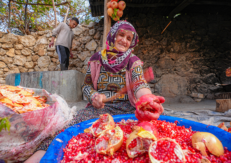 'Olgunlaşan narlar çatlıyor, biz de topluyoruz ve eve getiriyoruz. Tanelerini değnekle döküyoruz. Suyunu çıkarıp kaynatıyoruz. Kaynama sırasında sürekli köpüğünü alıyoruz. Zor bir iş. Ağaçların tepesinden inene kadar akla karayı seçiyoruz. Narları gündüz topluyoruz, geceleri de tanelerini döküyoruz. Tekrar gündüz suyunu kaynatıyoruz. Gece kaynatırsak köpüğünü iyi alamayız. Yağmur çamur olmadan yetiştirmeye çalışıyoruz. Büyük ve zorlu bir emekle hazırladığımız nar ekşisi her derde deva ve doğal.'
