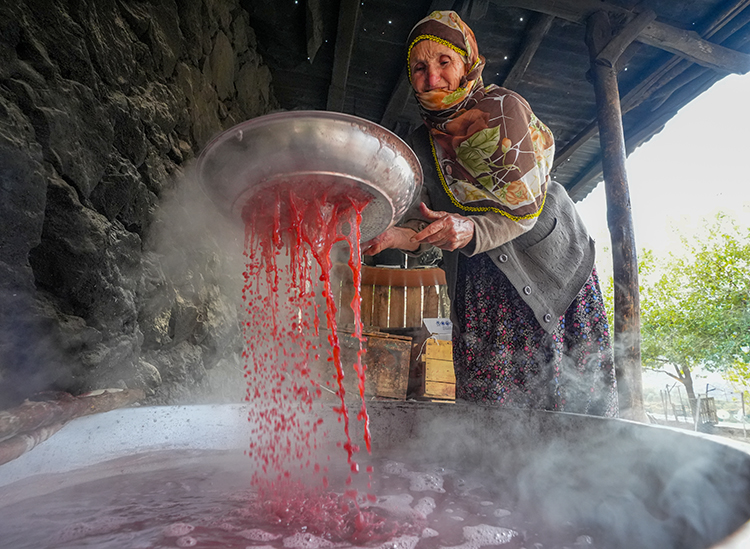 Ardından çuvallara doldurulan nar taneleri ezilerek suyu çıkarılıyor. Kadınlar, elde ettikleri nar suyunu, kurulan kazanlarda odun ateşinde saatlerce kaynatarak nar ekşisine dönüştürüyor.
