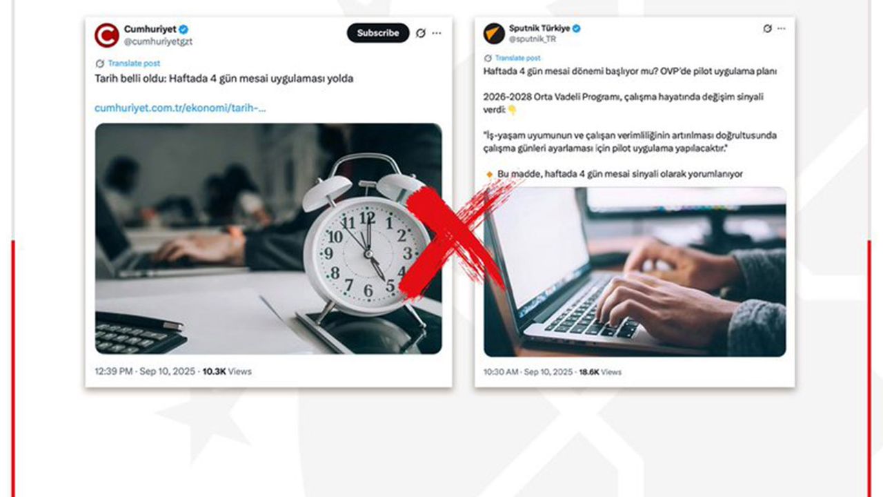 Cumhurbaşkanlığı İletişim Başkanlığı bünyesindeki Dezenformasyonla Mücadele Merkezi (DMM), söz konusu iddialarla ilgili yaptığı açıklamada, dört gün mesai uygulamasının gündemde olmadığını vurguladı.