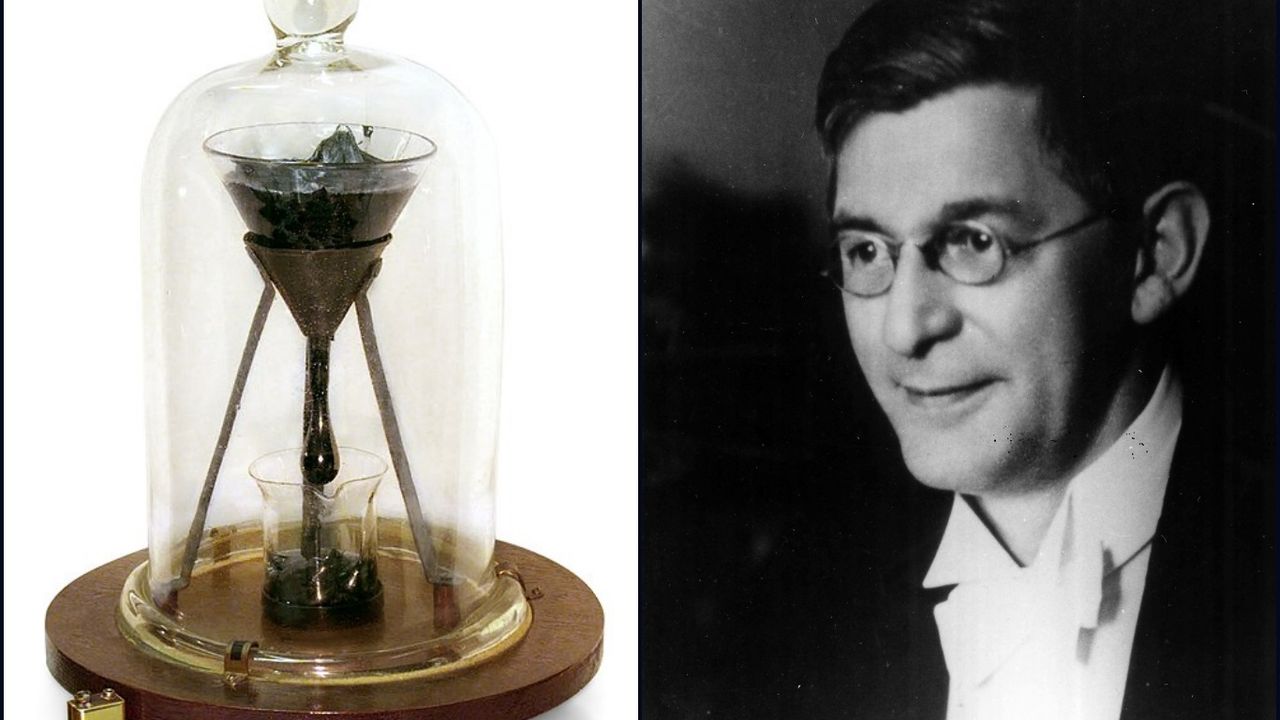 O andan itibaren siyah renkli madde akmaya başladı, ya da en azından bilimsel anlamda akmaya. Oda sıcaklığında katı gibi görünen pitch, gerçekte sudan yaklaşık 100 milyar kat daha viskoz bir akışkan. Bu nedenle ilk damlanın alttaki beher kaba düşmesi tam sekiz yıl sürdü.