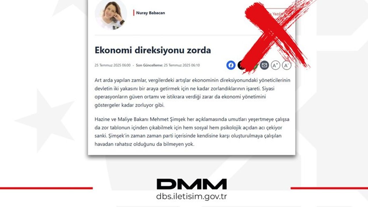 Cumhurbaşkanlığı İletişim Başkanlığı Dezenformasyonla Mücadele Merkezi (DMM), bazı basın organlarında “Ekonomi Direksiyonu Zorda” başlığıyla Hazine ve Maliye Bakanı Mehmet Şimşek’e atfen dile getirilen söylemler, kabine üyeleri arasında yaşandığı iddia edilen gerilimler ve ekonomi yönetimine ilişkin iddiaların “tamamen asılsız, spekülatif ve kamuoyunu yanıltmaya yönelik dezenformasyon içeriği taşıdığını” açıkladı.