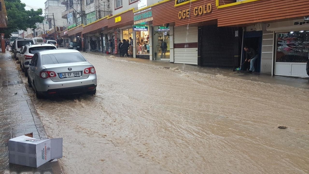 Su taşkınlarının yaşandığı ilçede, yağmur tahliye sistemlerinin yetersiz kalması nedeniyle caddeler ve sokaklar sular altında kaldı.