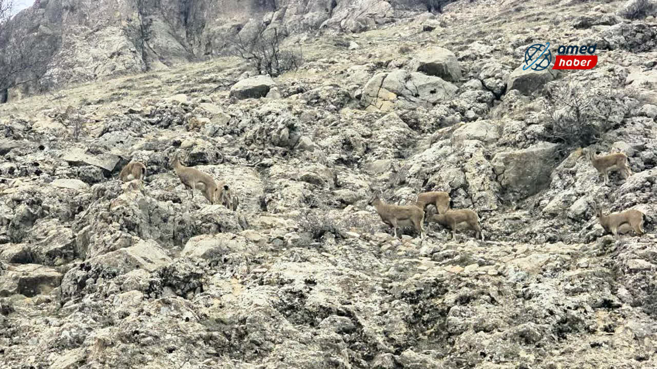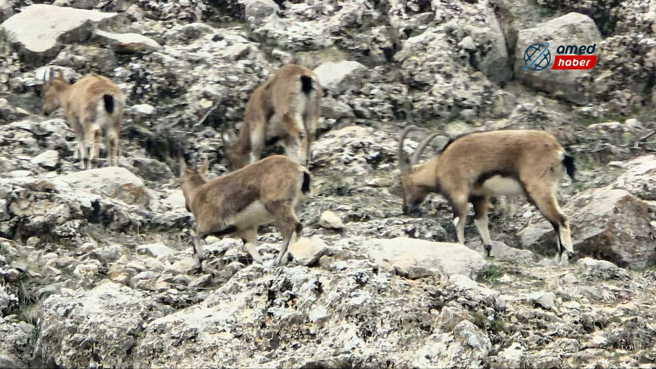 Diyarbakır'ın Ergani ilçesinde bulunan Makam Dağı'nda yaban hayatı kameralara yansıdı. Kayalık ve sarp arazide 7 dağ keçisinin sürü halinde dolaştığı anlar görüntülendi.