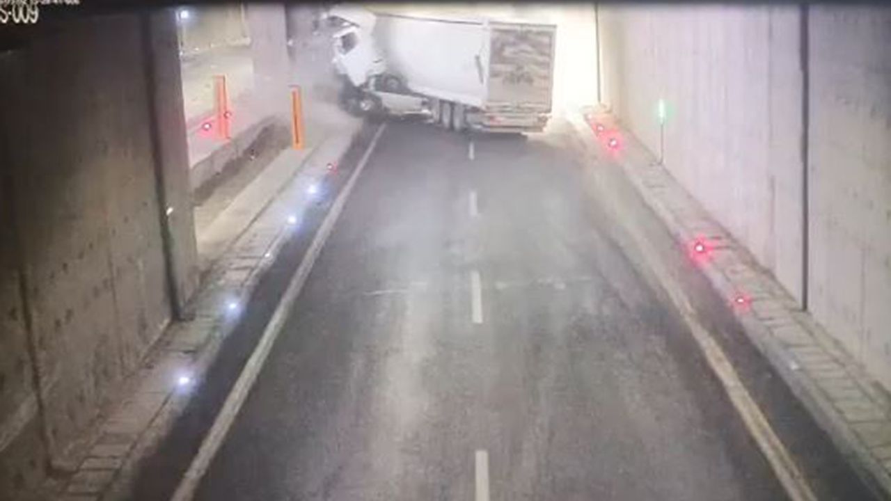 Görüntülerde tırın kontrolden çıkarak hızla tünel duvarına çarptığı ve kafa kısmı dorseden ayrılarak hurdaya döndüğü görülüyor.