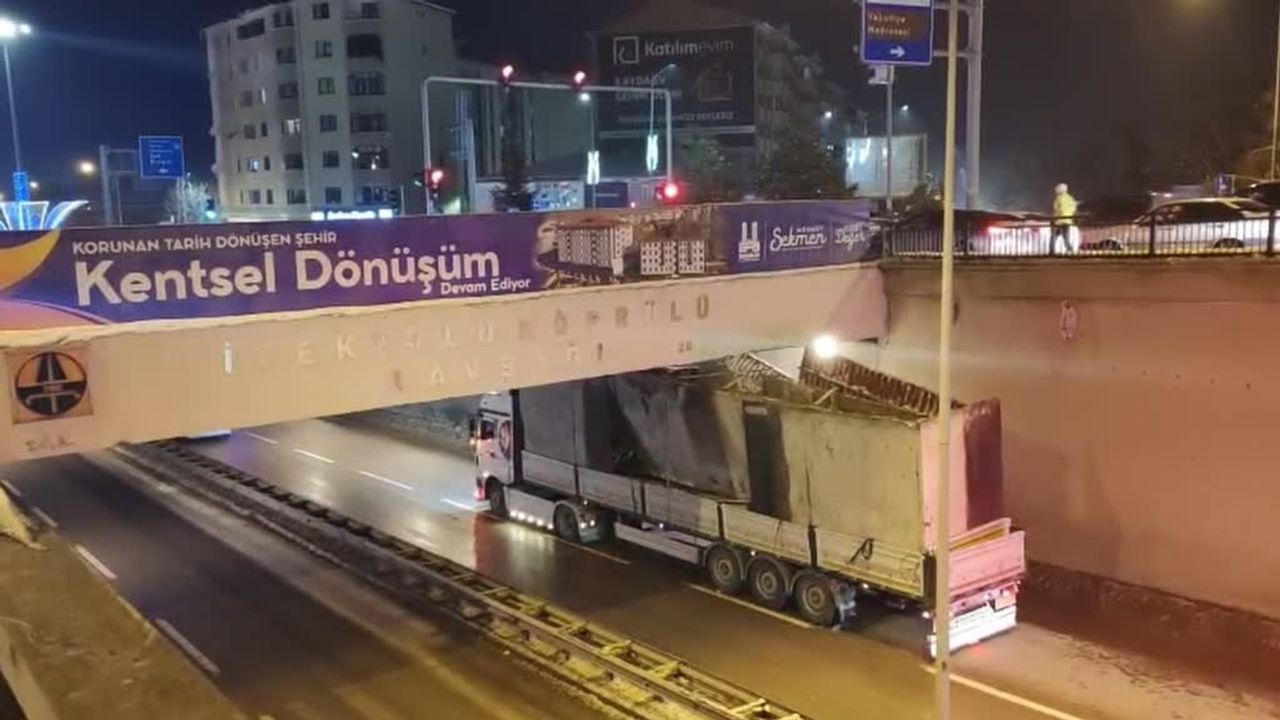 İpekyolu Köprülü Kavşağı’ndaki alt geçide giren, sürücüsü henüz öğrenilemeyen 25 ABR 003 plakalı beton blok yüklü tır geçide sıkıştı. İhbar üzerine olay yerine polis ekipleri sevk edildi.