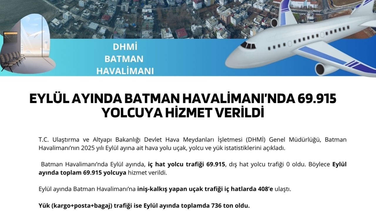 Açıklamaya göre, Eylül ayında Batman Havalimanı'nda iç hat yolcu trafiği 69 bin 915 olarak kaydedildi. Dış hat yolcu trafiği bulunmazken, toplamda 69 bin 915 yolcuya hizmet verildi.