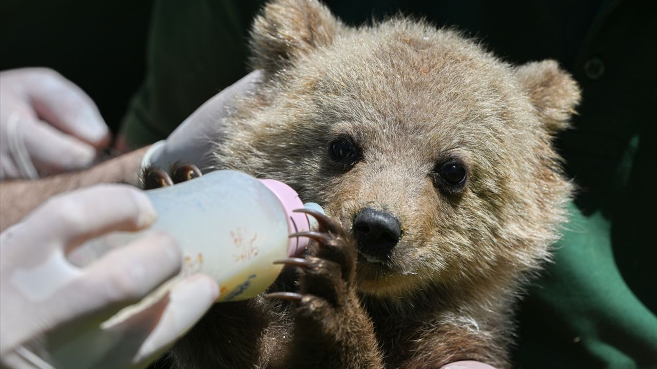 Özenle bakılan ve sütle beslenen ayı yavrusu "Boncuk", ziyaretçilerin ilgisini çekiyor.