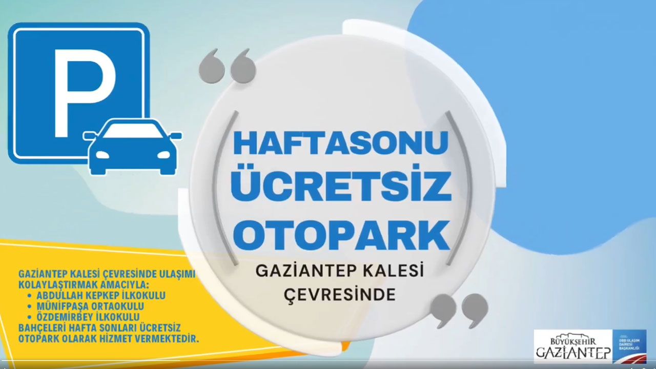 Büyükşehir Belediyesi'nden yapılan açıklamaya göre, şehrin tarihi yapılarının ile mahallelerinin bulunduğu, yerli ve yabancı turistlerin uğrak yeri olan Gaziantep Kalesi çevresinde araç parkı sorunu için çözüm üreten Büyükşehir Belediyesi, bölgede bulunan Abdullah Kepkep İlkokulu, Münifpaşa Ortaokulu, Özdemirbey İlkokulları'nın bahçelerinde hafta sonları ücretsiz otopark hizmeti verecek.