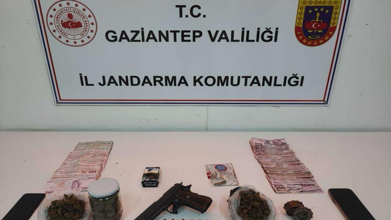 Şahinbey ilçesinde saklandığı bağ evine düzenlenen operasyonda yakalanan şüphelinin adresinde yapılan aramada 1 kilo 175 gram skunk, 1 adet ruhsatsız tabanca, 7 adet tabanca mermisi, 2 adet cep telefonu, 1 adet uyuşturucu kullanma aparatı ve 45 bin TL suç geliri para ele geçirildi.
