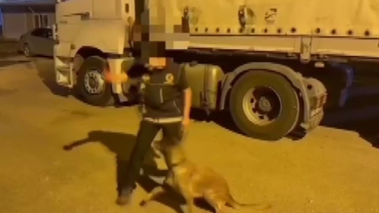 Emniyetin paylaştığı görüntülerde, narkotik köpeğinin arama çalışmalarına destek vermesi ve tırda uyuşturucu ele geçirilme anları yer aldı.