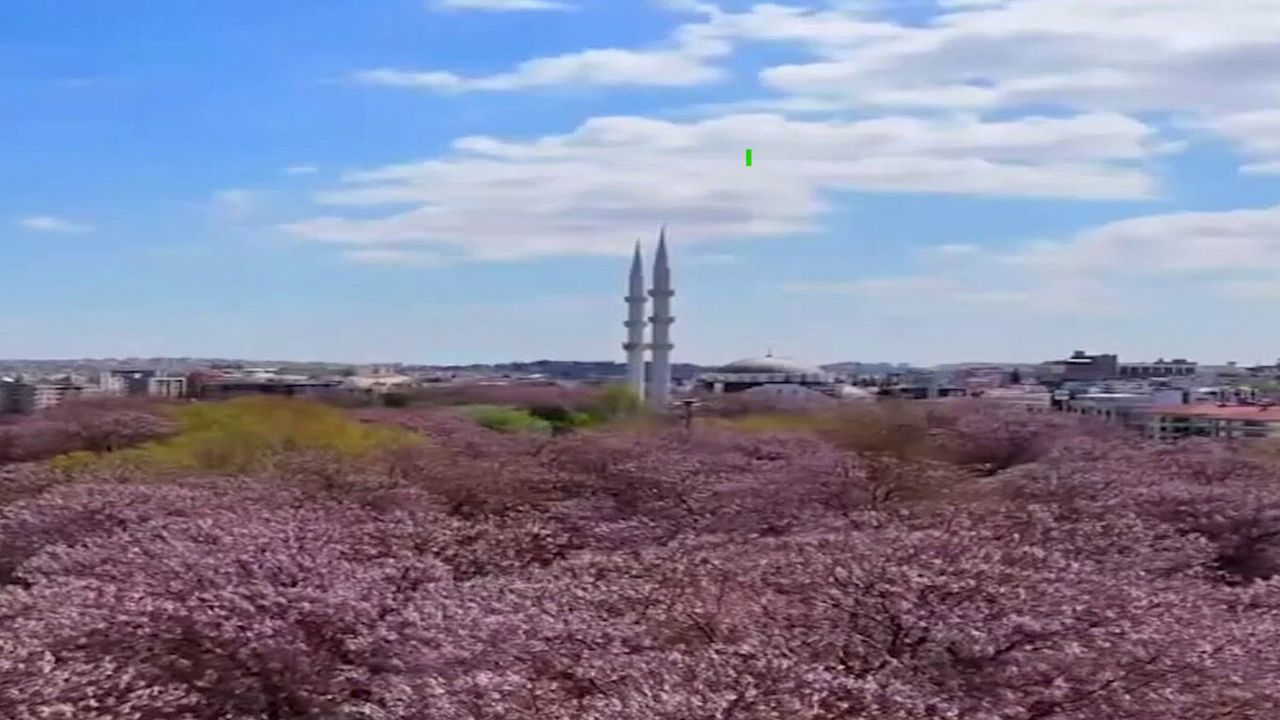 Gökyüzünün maviliği ile ağaçların derin mor ve pembe tonları, görenlere görsel şölen sunuyor.
