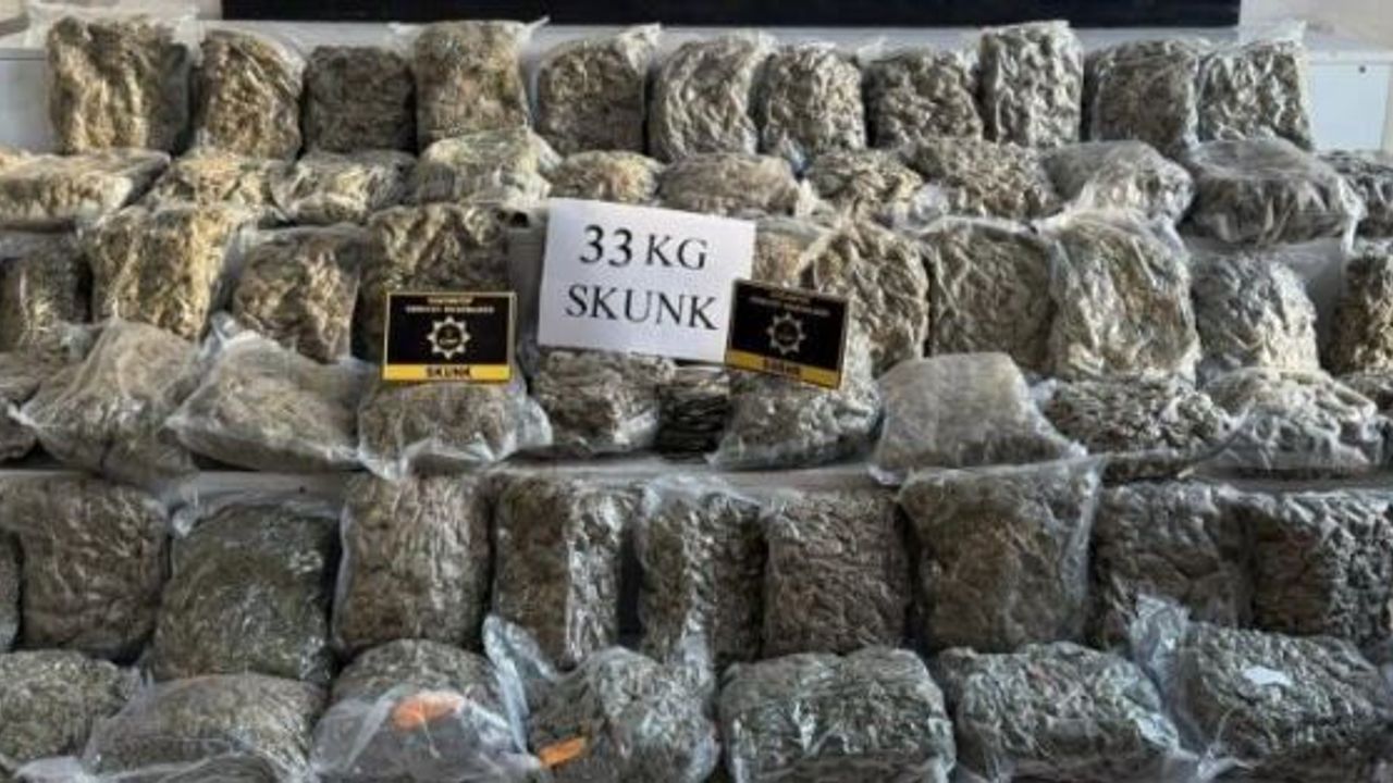 Hassas burunlu dedektör köpeklerin de kullanıldığı aramalarda, tırın dorsesine gizlenmiş zula içerisinde 33 kilo 500 gram skunk ile 450 gram esrar ele geçirildi.