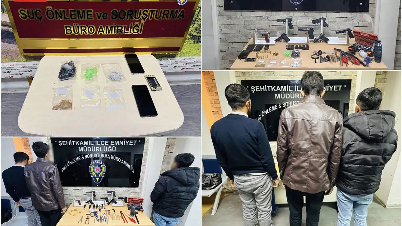 Şehitkamil İlçe Emniyet Müdürlüğü ekiplerinin yaptığı operasyonlarda 7 adet ruhsatsız tabanca, 36 adet fişek, 7 adet şarjör, kurusıkı silahları ateşli silaha çevirmede kullanılan malzemeler, bir miktar uyuşturucu madde ile 1 adet hassas terazi ele geçirildi.