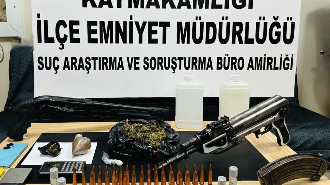 Ekiplerce yapılan çalışmalarda, 1 adet AK-47 kaleşnikof tüfek, 1 adet pompalı tüfek, 42 adet fişek, 1,2 litre sentetik kannobinoid, 87 gram sentetik uyuşturucu, 1 hassas terazi ele geçirildi.