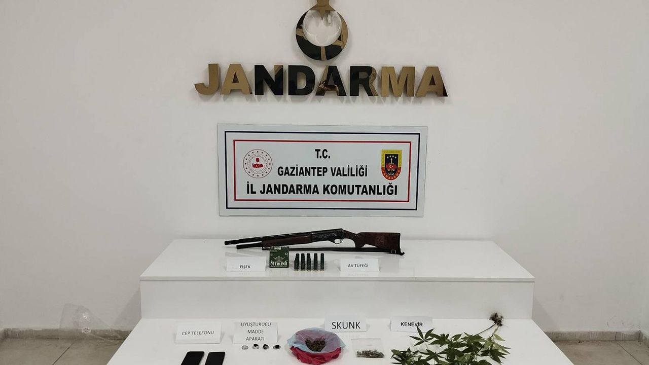 Yapılan aramalar neticesinde, 403 kök kenevir bitkisi, 50 gram skunk cinsi uyuşturucu, 32 gram kenevir tohumu, 19 adet uyuşturucu kullanma aparatı, 1 adet hassas terazi, 1 adet ruhsatsız av tüfeği, 20 adet av tüfeği fişeği ele geçirildi.