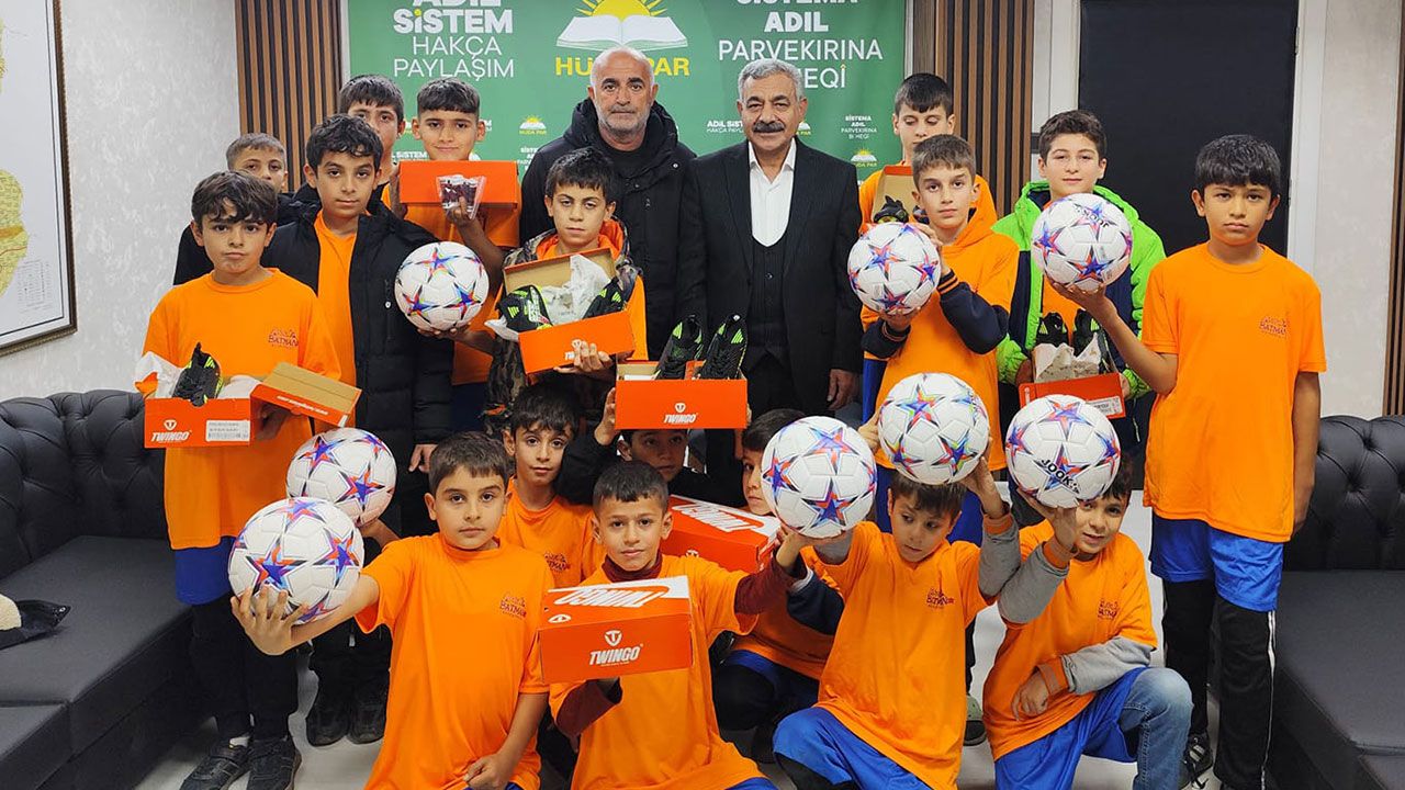 Genç sporcularla yakından ilgilenen İl Başkanı Şahin, takımın tamamına futbol topu ve krampon hediye ederek başarılar diledi.