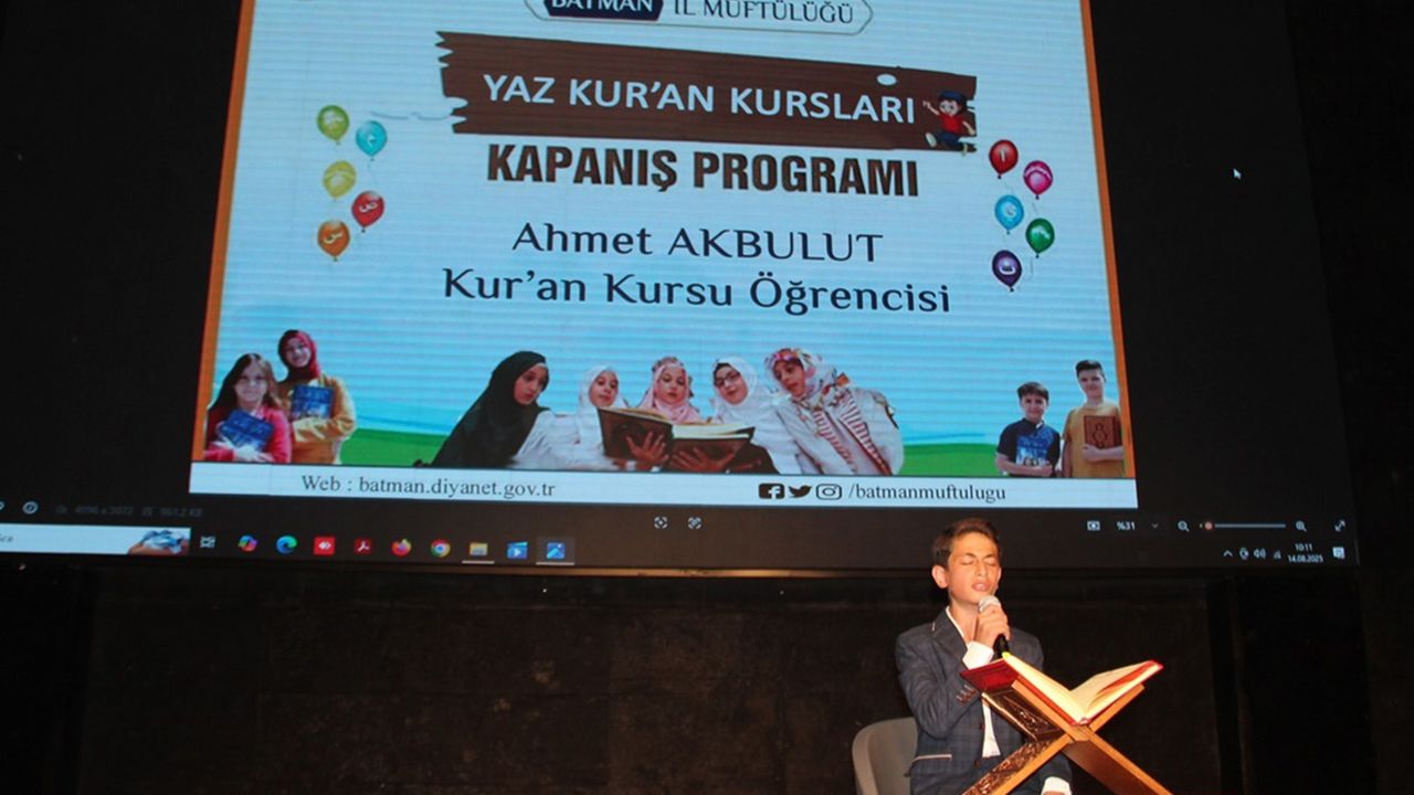 Durmuş kurslarda emeği geçen herkese teşekkür ederek, 'Bugün yaz tatili boyunca camilerimizi, Kur'an kurslarımızı ve medreselerimizi şenlendiren çocuklarımız için kapanış programı gerçekleştirdik. Çocuklarımız cami, mihrap, minber, Kur'an ve Elif-Ba ile buluştular. Bugün sevinç içerisindeyiz.' ifadelerini kullandı.