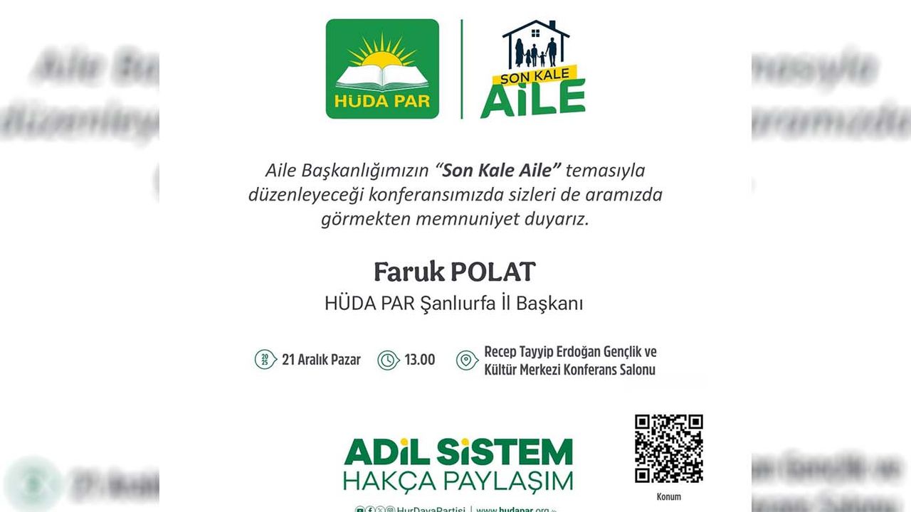 HÜDA PAR Şanlıurfa İl Başkanlığı tarafından Aile Başkanlığı koordinesinde düzenlenecek programda, toplumun temel taşı olan ailenin korunması ve güçlendirilmesine yönelik önemli değerlendirmeler ele alınacak. Programa konuşmacı olarak akademisyen Prof. Dr. Saffet Köse katılacak.