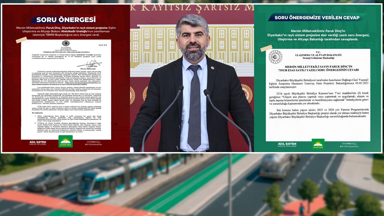 HÜDA PAR Milletvekili Dinç, 14 Şubat tarihinde verdiği soru önergesinde, Diyarbakır’da uzun süredir gündemde olan ancak hayata geçirilemeyen kent içi raylı sistem projesine ilişkin mevcut durumu ve Bakanlığın planlamalarını sormuştu.