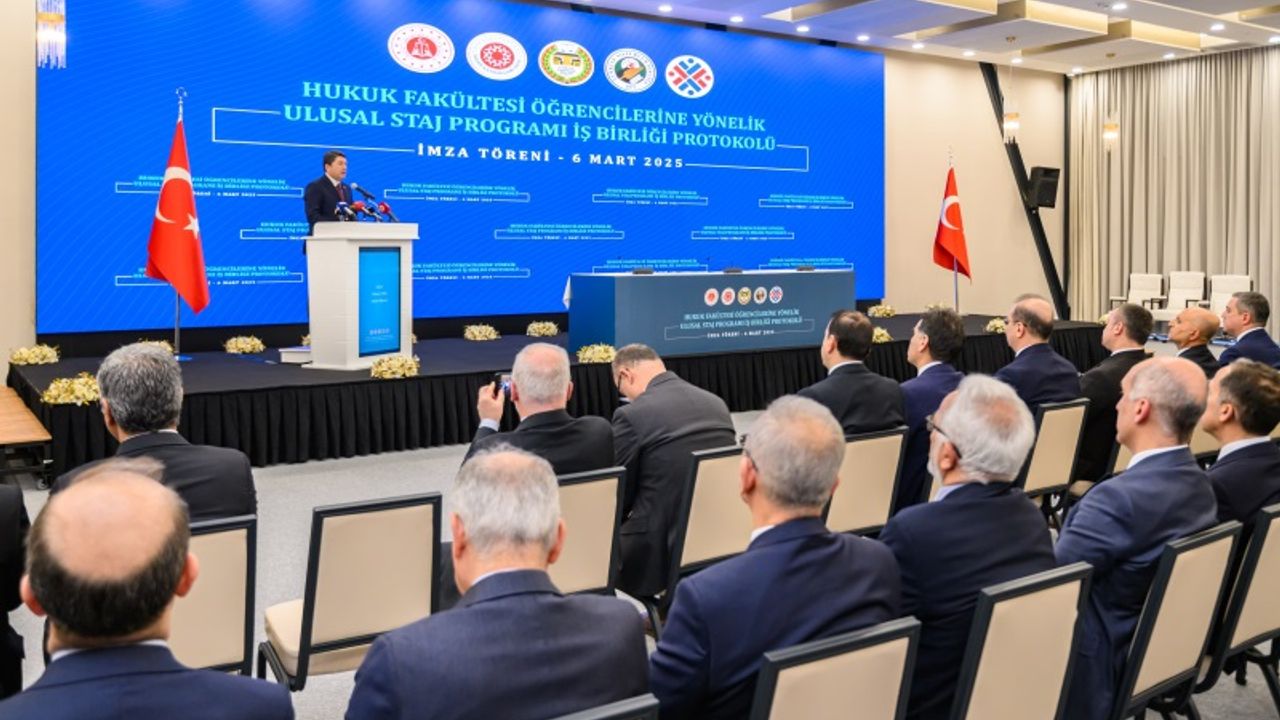 Adalet Bakanı Yılmaz Tunç, Hakimevinde düzenlenen ve hukuk fakültesi öğrencilerinin Ulusal Staj Programı kapsamında avukatlık büroları, noterlikler, arabuluculuk büroları ve merkezlerinde staj yapabilmelerine olanak tanıyan işbirliği protokolü imza törenine katıldı.