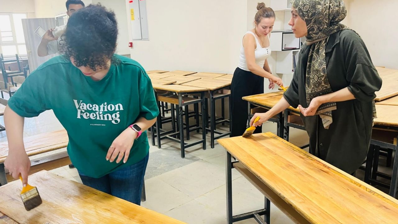 Lisede görevli olan idareci ve öğretmenler, seminer dönemi çalışmaları kapsamında, 20 sınıfın yıpranmış sıralarını zımparalayıp vernikleyerek yeniledi.