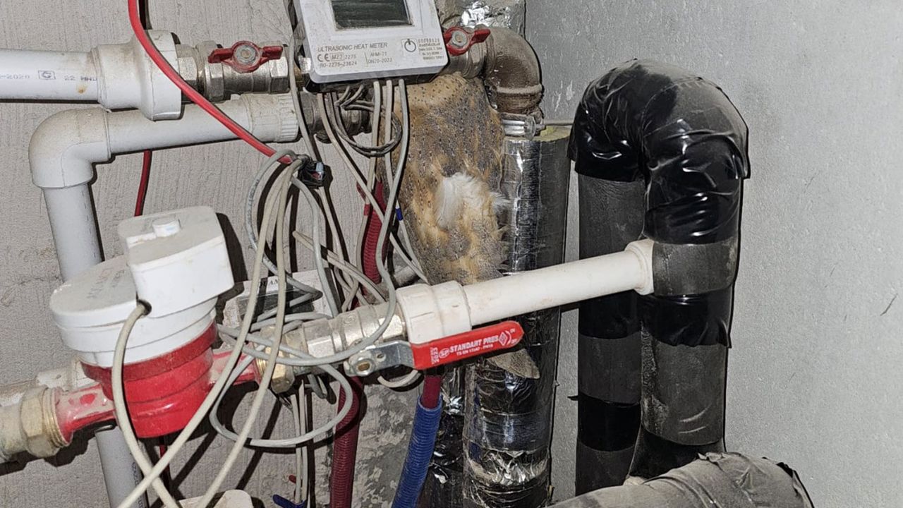 Atatürk Mahallesi’ndeki yeni yapılan deprem konutlarında oturan Kamil Özsöyleyen, binasında su tesisatın bulunduğu alana sıkışmış ve bitkin düşen peçeli baykuş gördü.