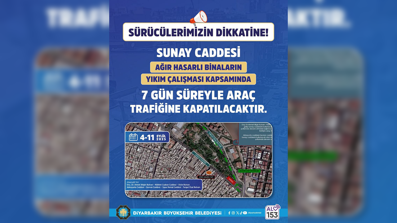 Diyarbakır Bağlar ilçesinde Sunay Caddesi olarak da bilinen Koşuyolu Parkı Caddesi, çevrede bulunan ağır hasarlı bir binanın yıkımı nedeniyle 11 Eylül’e kadar trafiğe kapatıldı.