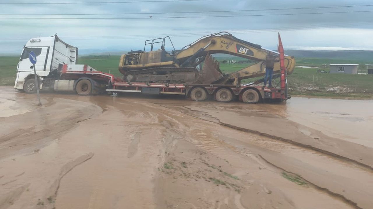 Aynı güzergahta bulunan ve üzerinde kepçe yüklü olduğu öğrenilen bir tır ise kaygan zemin nedeniyle yan yattı.