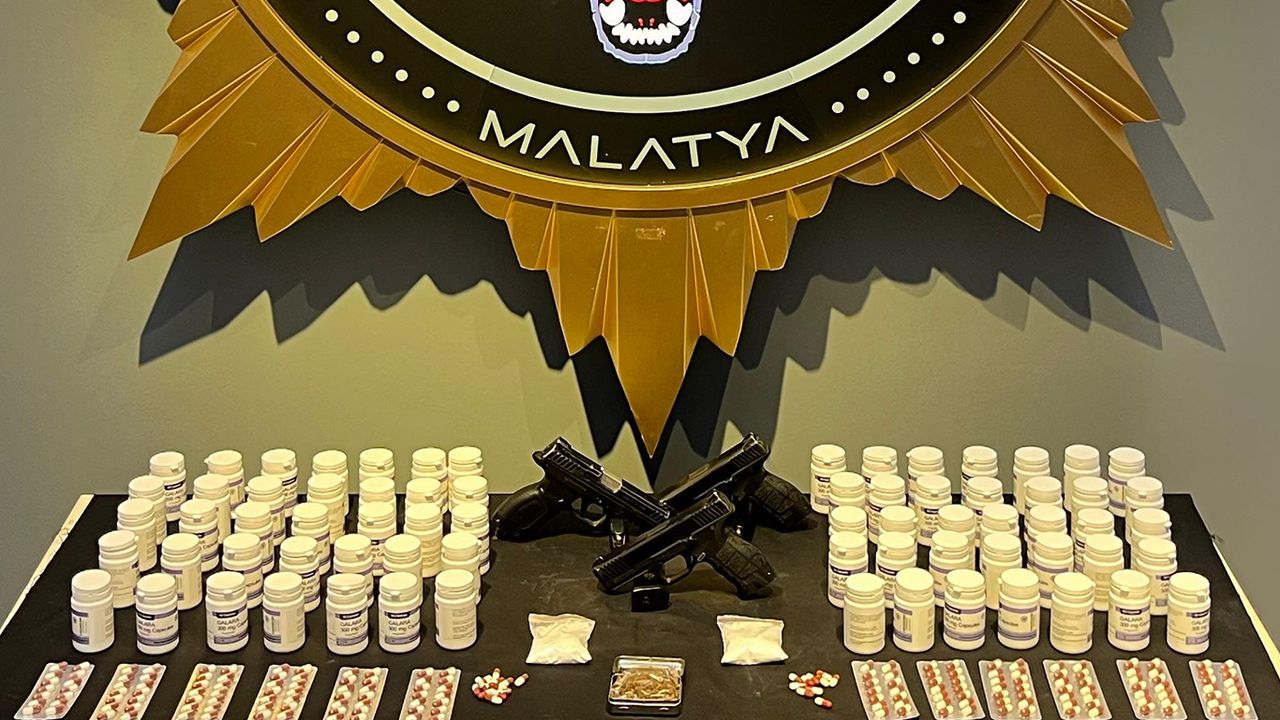 Yapılan operasyonda; 2 bin 330 adet sentetik ecza, 58,4 gram metamfetamin, 16,3 gram sentetik kannabinoid, 6 adet ecstasy hap, 3 adet ruhsatsız tabanca ele geçirildi.