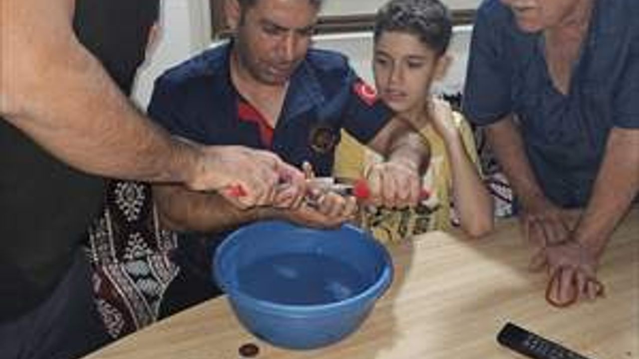 Mardin'in Nusaybin ilçesinde bir çocuğun parmağı sıkıştırdığı vida pulundan, itfaiye ekiplerinin müdahalesiyle çıkarıldı.