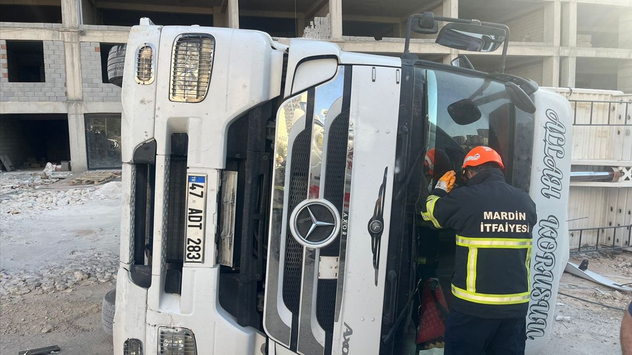 Nur Mahallesi'nde sürücüsünün kimliği henüz öğrenilemeyen 47 ADT 283 plakalı tır kontrolden çıkarak devrildi.