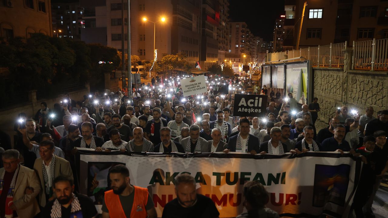 Mardin Sivil Toplum Kuruluşları Platformu öncülüğünde Artuklu Fuar Alanı'nda bir araya gelen katılımcılar, ellerinde Filistin bayraklarıyla tekbir getirdi, siyonist rejim karşıtı sloganlar attı.