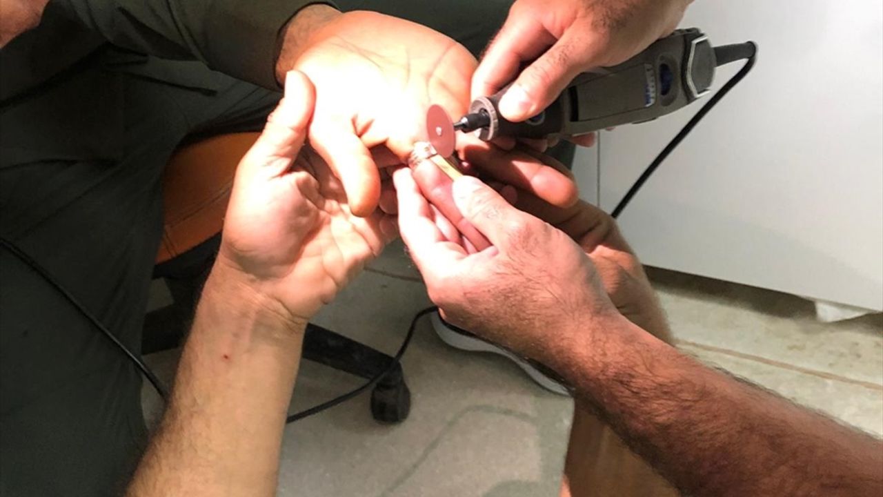 Hastaneye gelen ekip, yüzüğü, motorlu mini alet yardımıyla keserek çıkarttı.