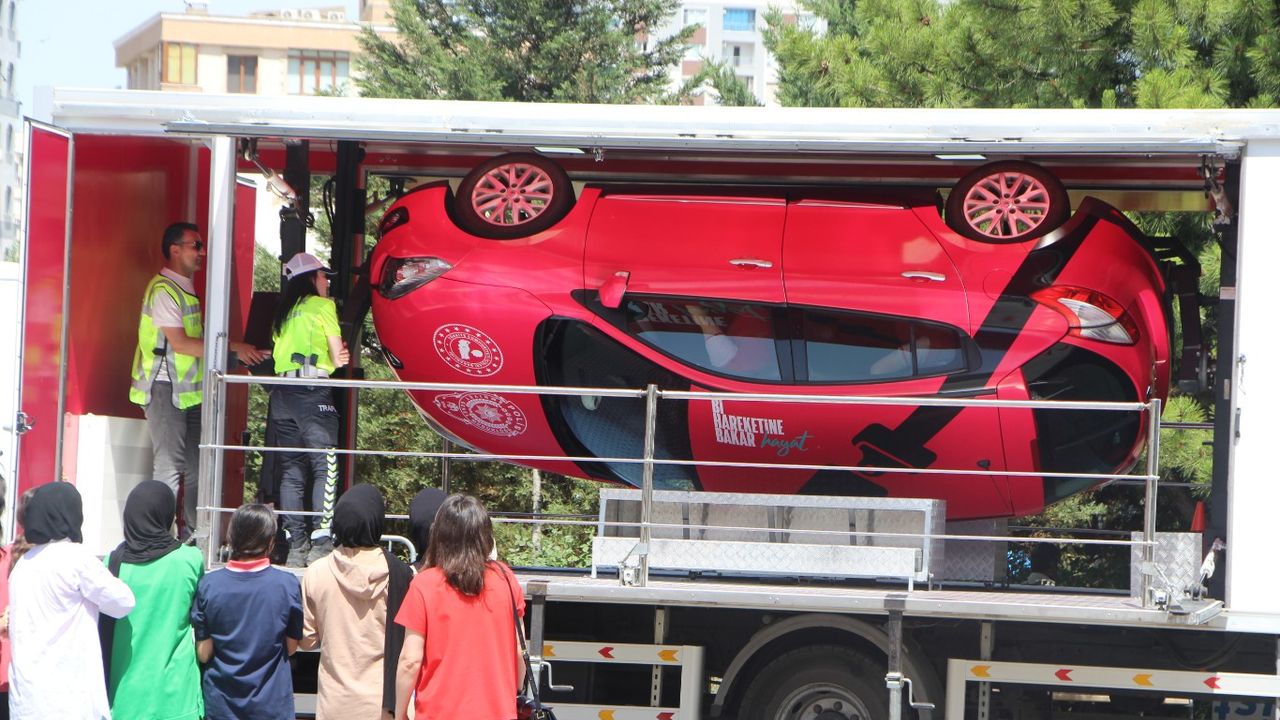 Mobil trafik eğitim tırı ve emniyet kemeri simülasyon aracıyla yapılan etkinlikte katılımcılar, kaza anında araç içinde yaşanabilecekleri birebir deneyimledi.