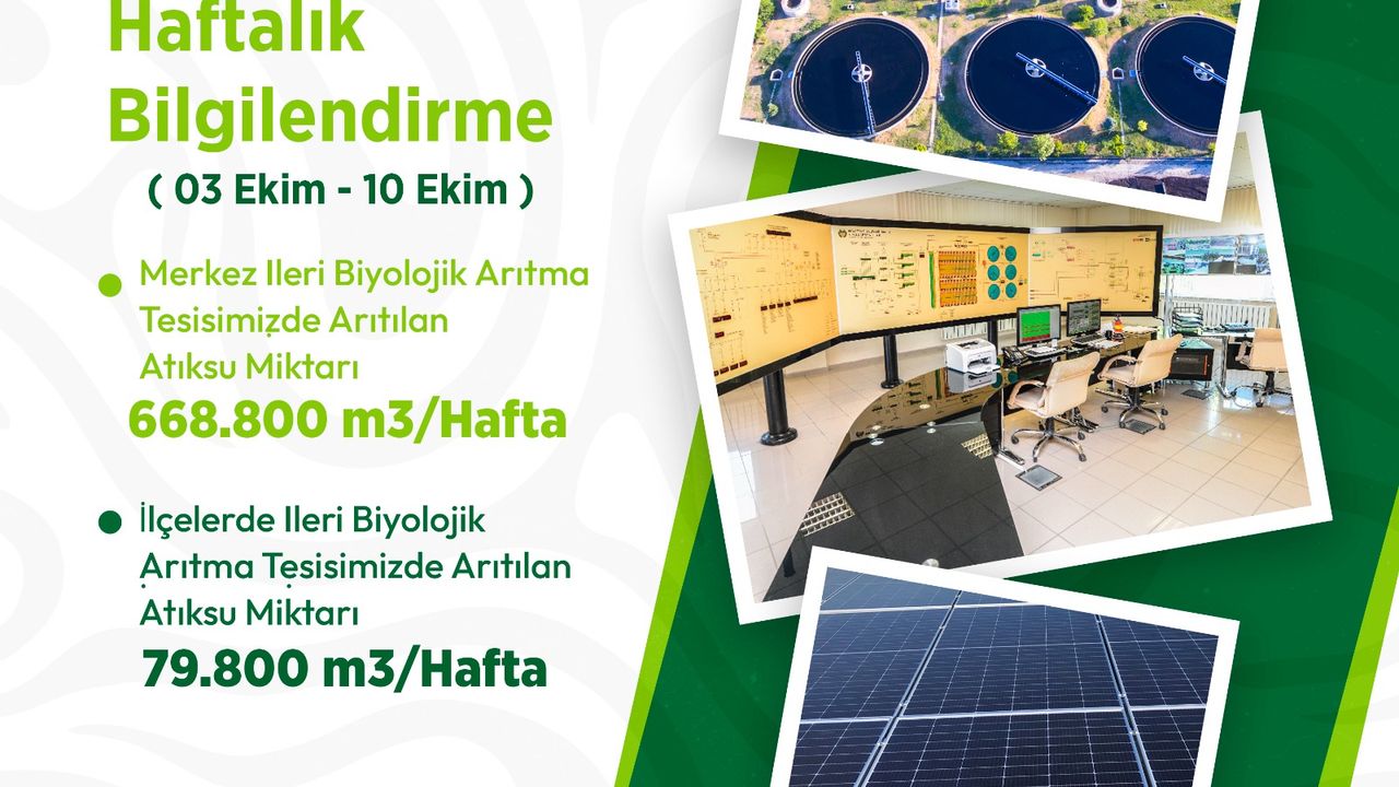 Buna göre, Merkez İleri Biyolojik Arıtma Tesisinde bu süre zarfında 668.800 m³ atıksu arıtıldı. İlçelerdeki ileri biyolojik arıtma tesislerinde ise arıtılan atıksu miktarı 79.800 m³ olarak kaydedildi.