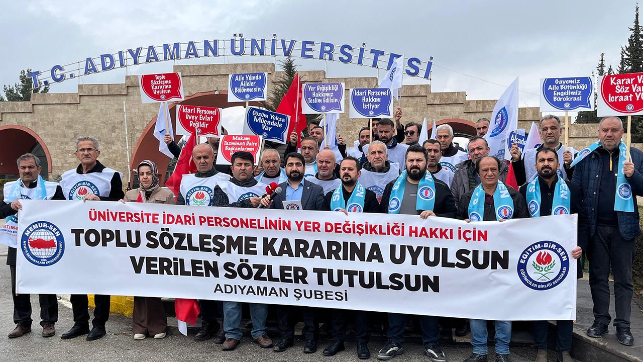 Adıyaman Üniversitesi önünde gerçekleştirilen basın açıklamasında toplu sözleşme süreçlerinde alınan kararların uygulanması, üniversite idari personeline yer değişikliği hakkı tanınması ile birlikte diğer özlük ve mali haklarla ilgili talepler dile getirildi.