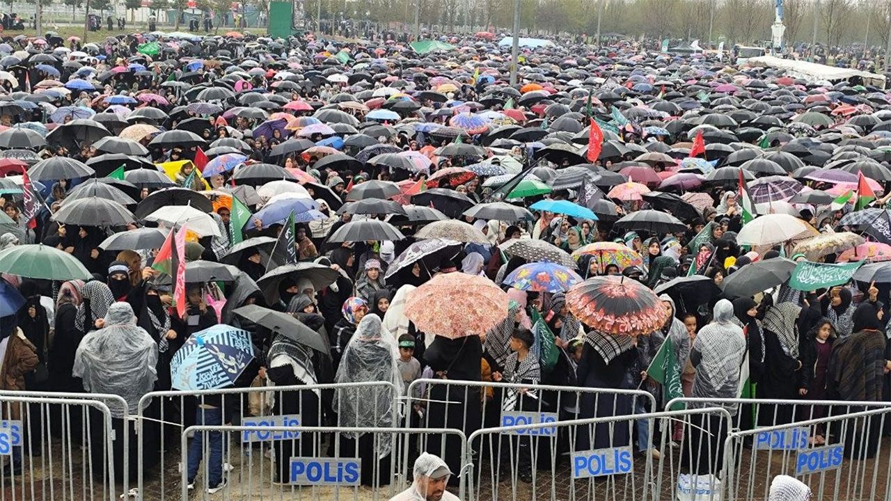 Bazı katılımcıların Kassam Tugayları Sözcüsü Ebu Ubeyde, HAMAS liderleri İsmail Heniyye ile Yahya Sinvar'ın posterlerini taşıdığı görüldü.