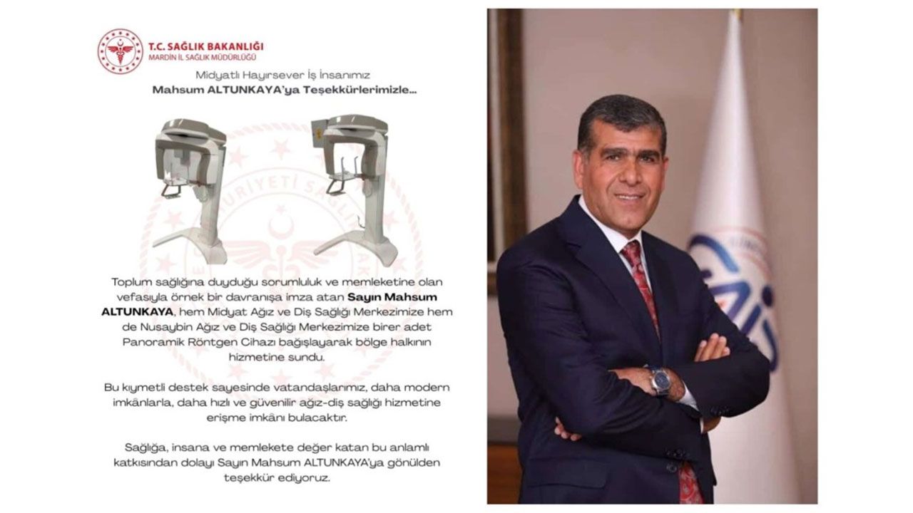 İl Sağlık Müdürlüğünden yapılan açıklamada, iş insanı Mahsum Altunkaya'nın Midyat Ağız ve Diş Sağlığı Merkezi ile Nusaybin Ağız ve Diş Sağlığı Merkezi'ne birer panoramik röntgen cihazı bağışladığı belirtildi.